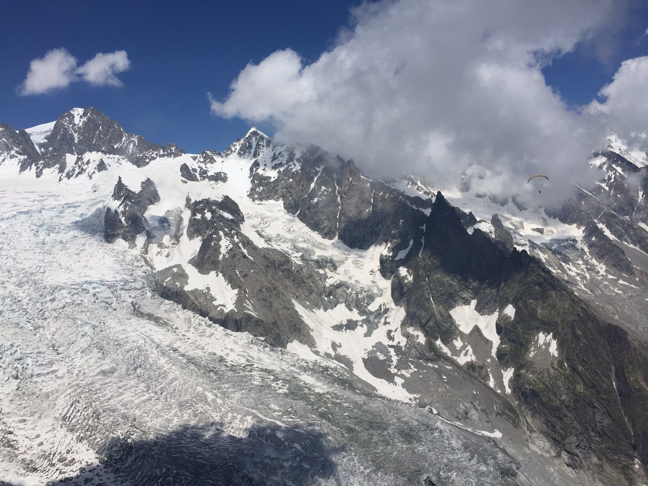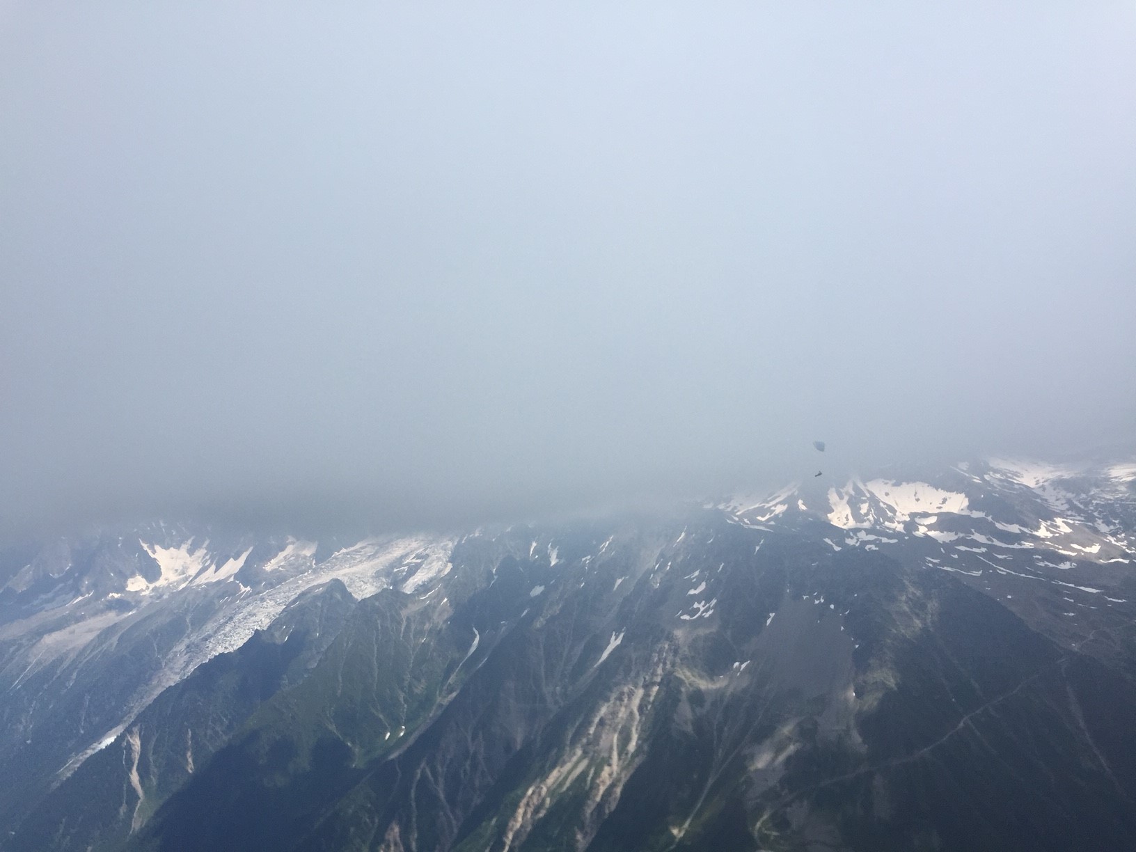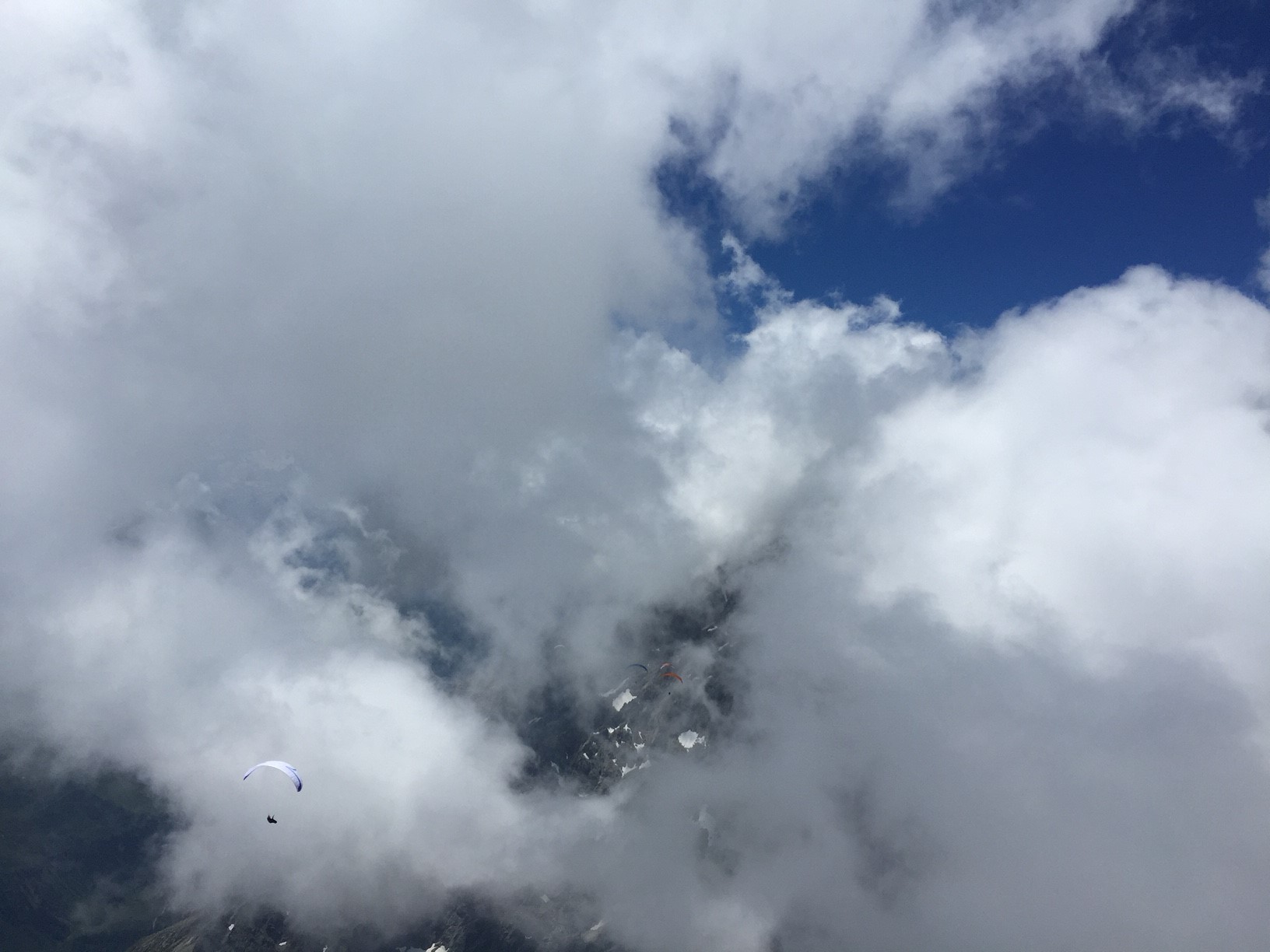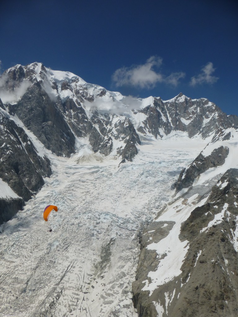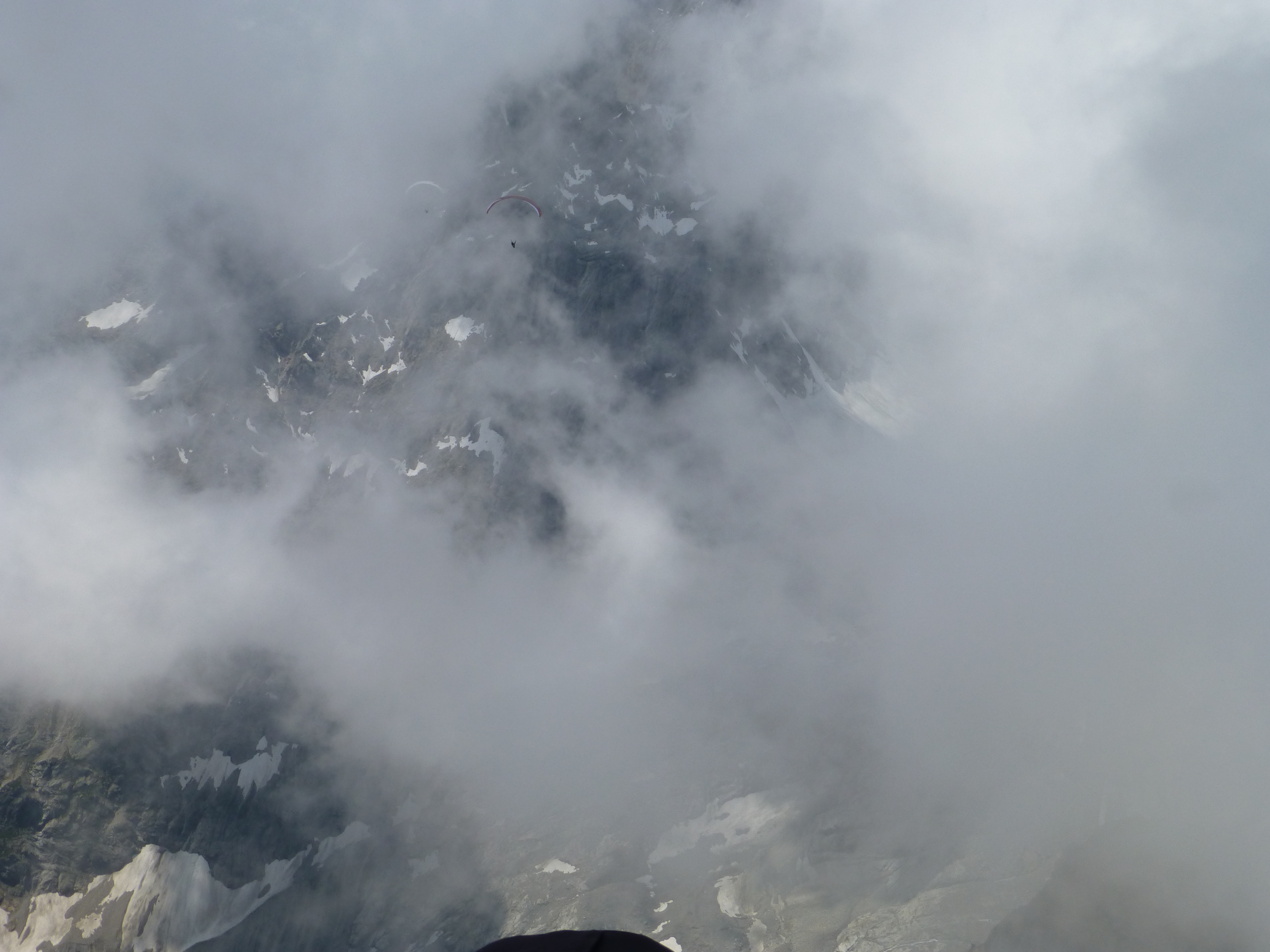 La suite est limpide ça monte aux barbules sans problème, plaf vers 3200mt glaciers, pics vertigineux, lacs cabanes défilent sous nous. Coté Italie les plafs sont très différents, des fois sur les nuages, parfois dessous, un petit vent de face vers Courmayeur et un thermique mal négocier me font prendre un peu de retard sur le groupe de tête. Arrête du brouillard, le vario hurle c’est gros ça monte…  presque à 4000mt hum… c’est bon!