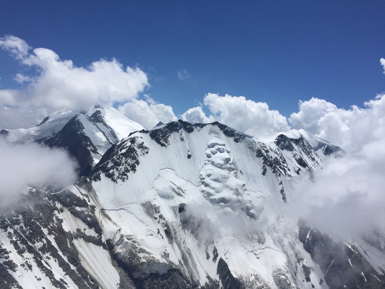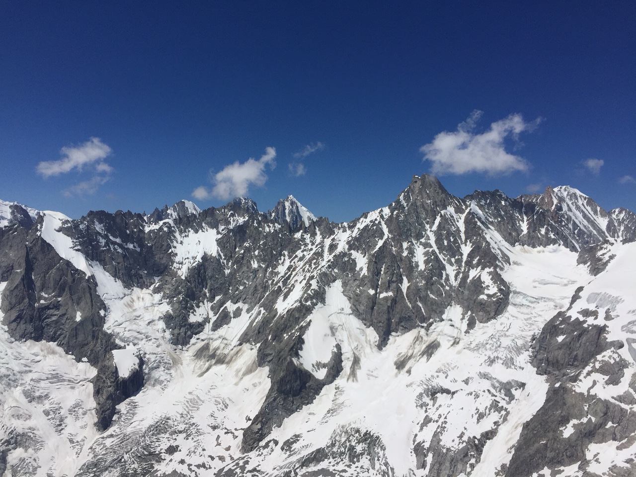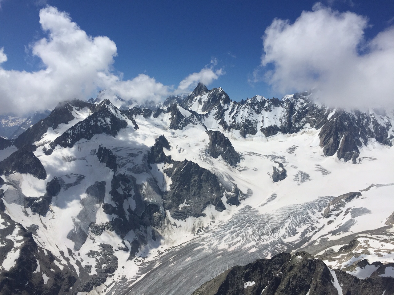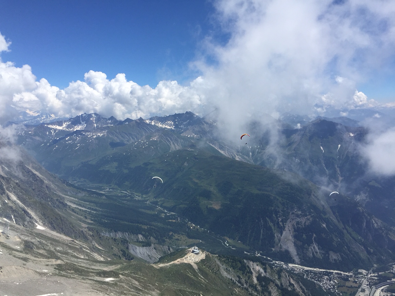 La suite est limpide ça monte aux barbules sans problème, plaf vers 3200mt glaciers, pics vertigineux, lacs cabanes défilent sous nous. Coté Italie les plafs sont très différents, des fois sur les nuages, parfois dessous, un petit vent de face vers Courmayeur et un thermique mal négocier me font prendre un peu de retard sur le groupe de tête. Arrête du brouillard, le vario hurle c’est gros ça monte…  presque à 4000mt hum… c’est bon!