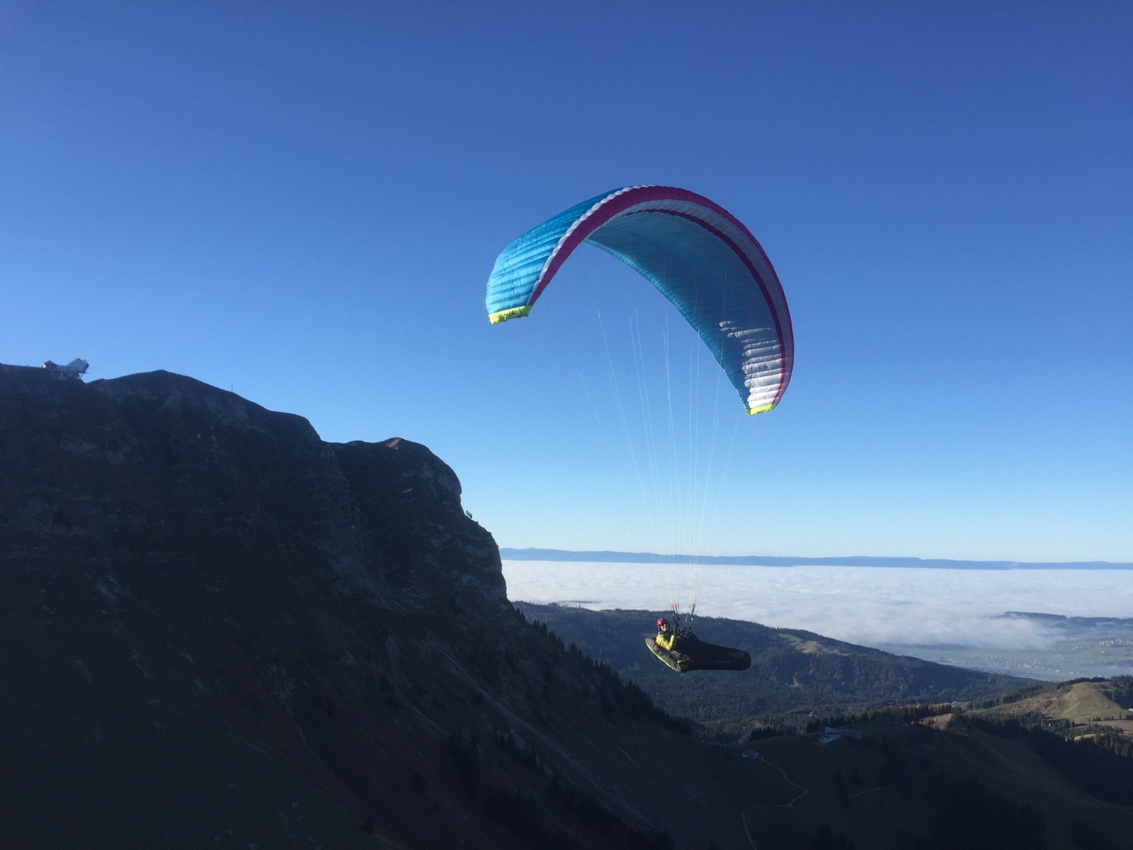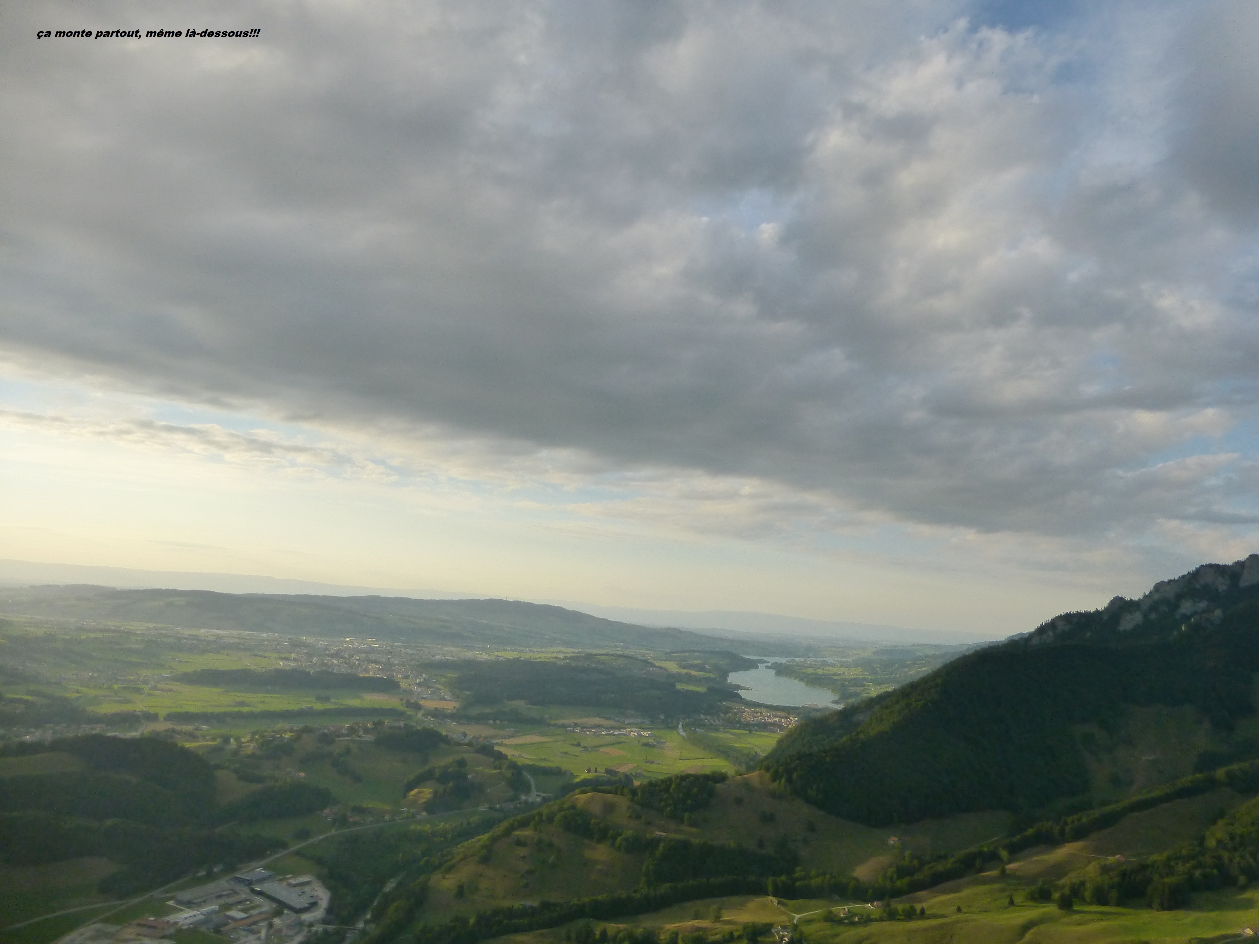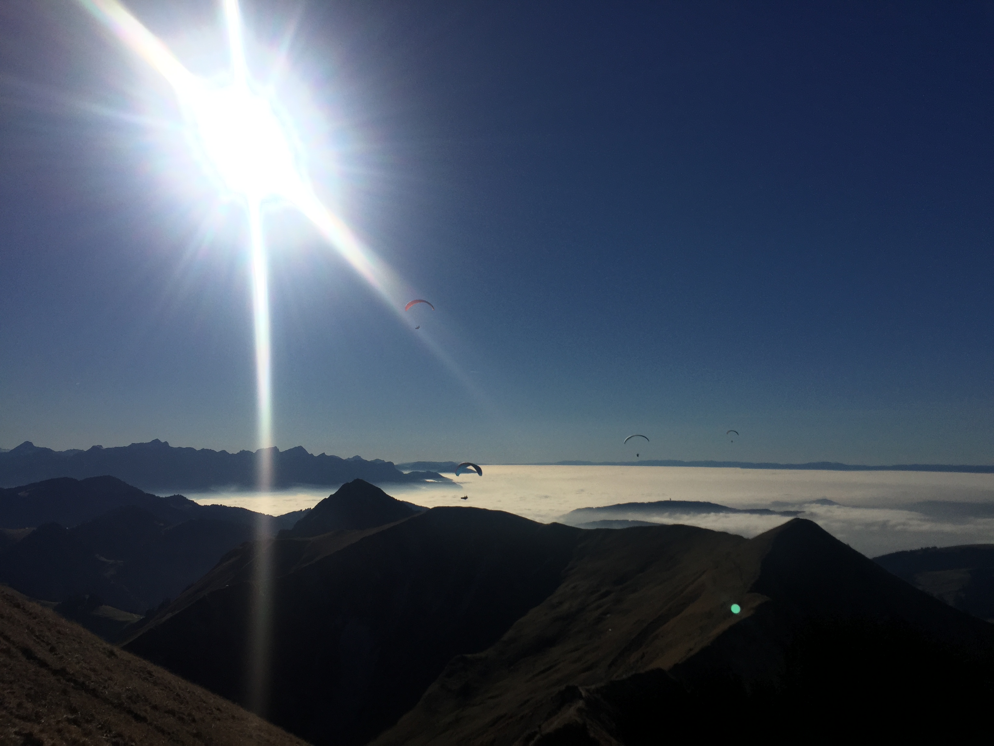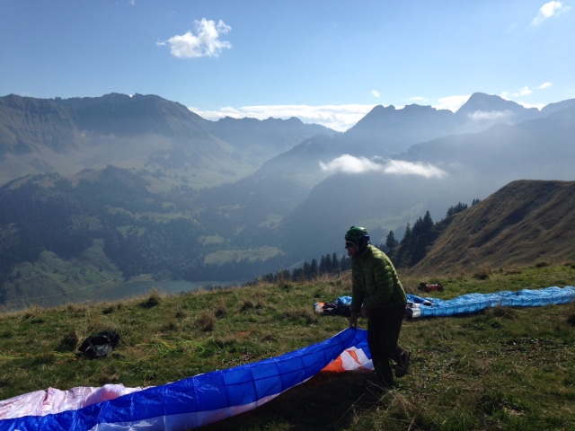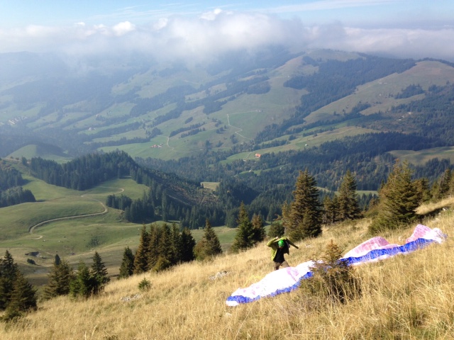 Tjs avec mon Guru Neuchatelois, mais avec mon plan… qui si la bise voudrait bien soufflé un poil plus, fonctionne, donc à pieds dir. Balisa, cueillette de bolet en route, et pause pipi, pic nic…  au Schwyberg! Un petit souffle pour décoller en Est,  l’inversion,  les nuages bas, nous font oublier les Recardets, on fonce direction La Balisa, on pose avant le col, une petite montée vers Patraflon, un déco de sauvage dans la végétation, et nous voilà derrière Vounetzt! Magnifique glide et hopo une bière au Cailler, tout ça en plein travail… si si, le téléphone arrète pas de sonner!