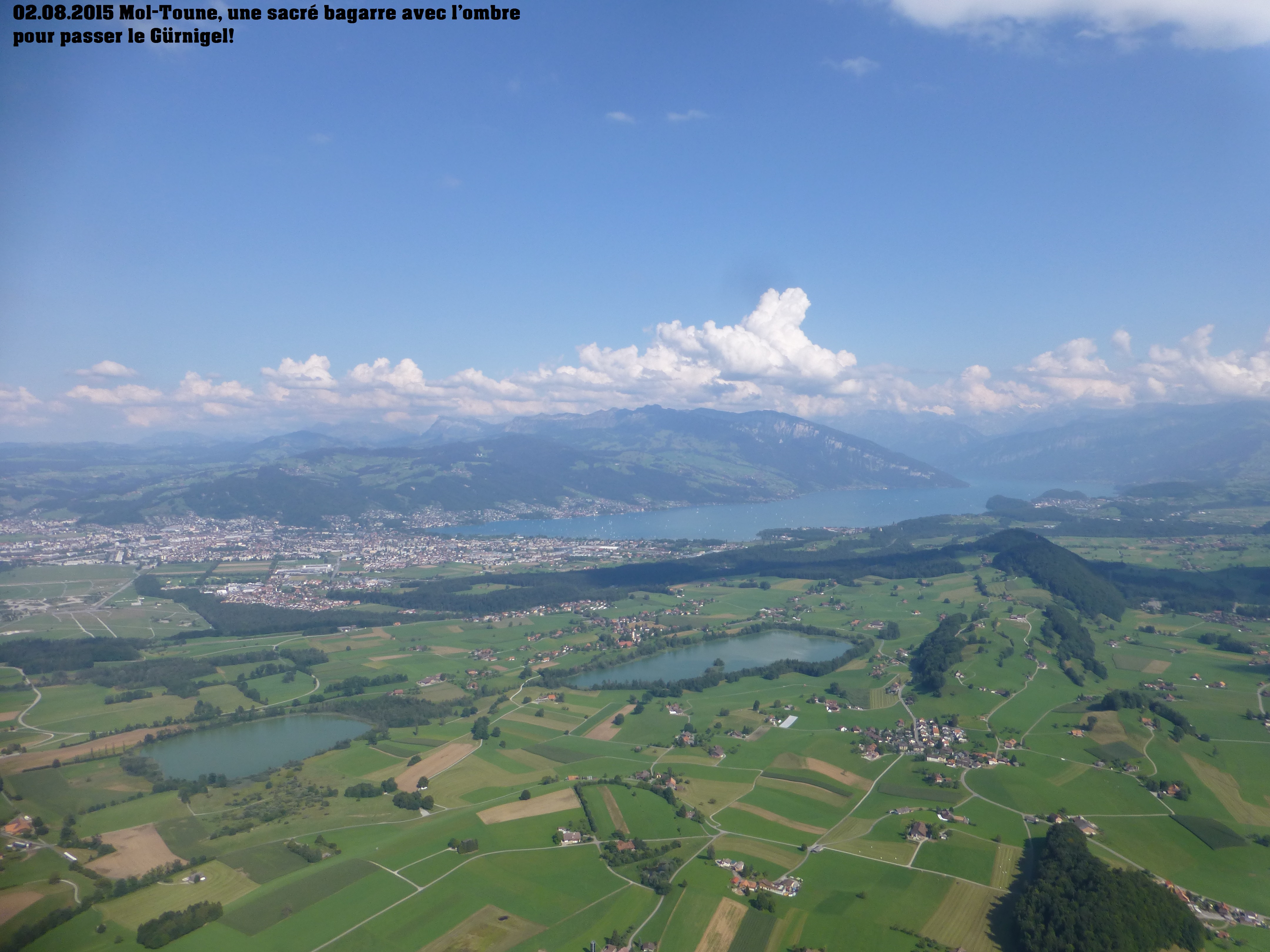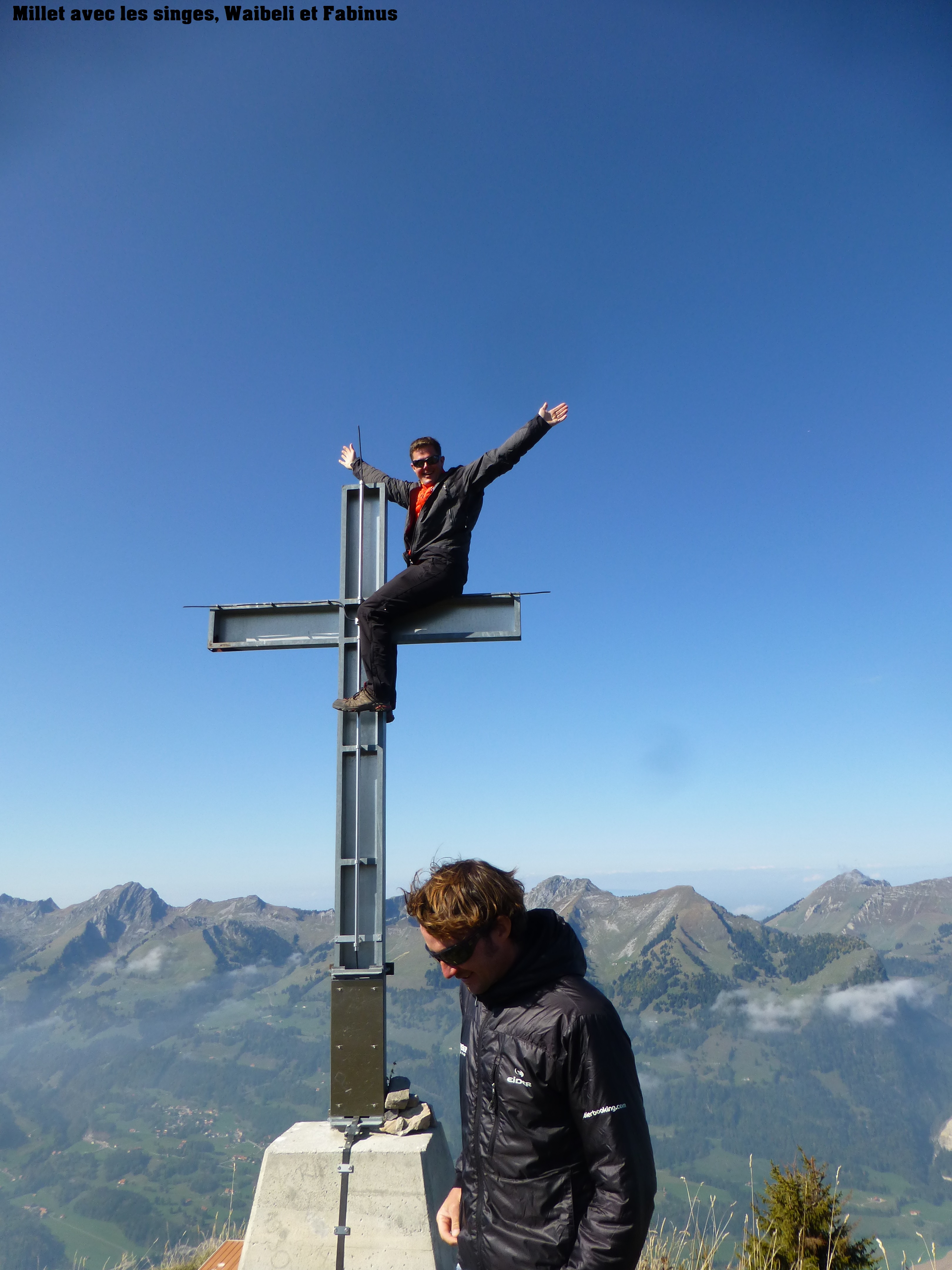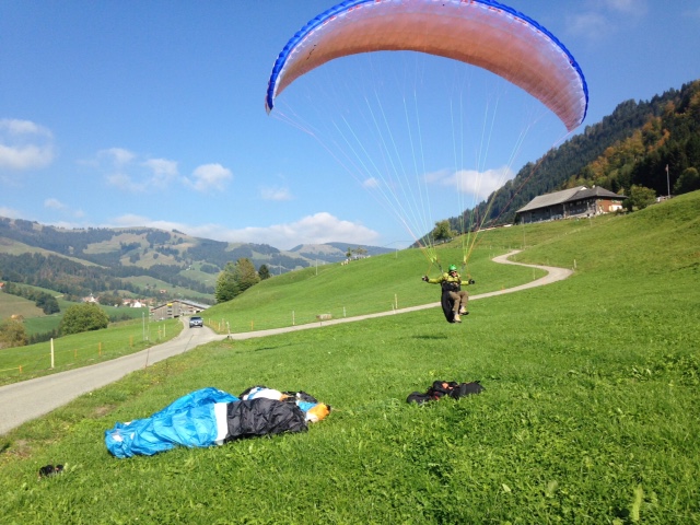 Superbe montée sous le soleil, le brouillard nous suis, mais arrive pas à nous rattraper, djeu ce qu’on marche vite!!! Là-haut thermiques au Sud, donc feu sur du coton et attéro au soleil, mais dans une bonne bise (vent de vallée) à château d’Oex. Bière de l’ours, train à vélo avec hôtesse  aimable et nous voilà en Gruyère.