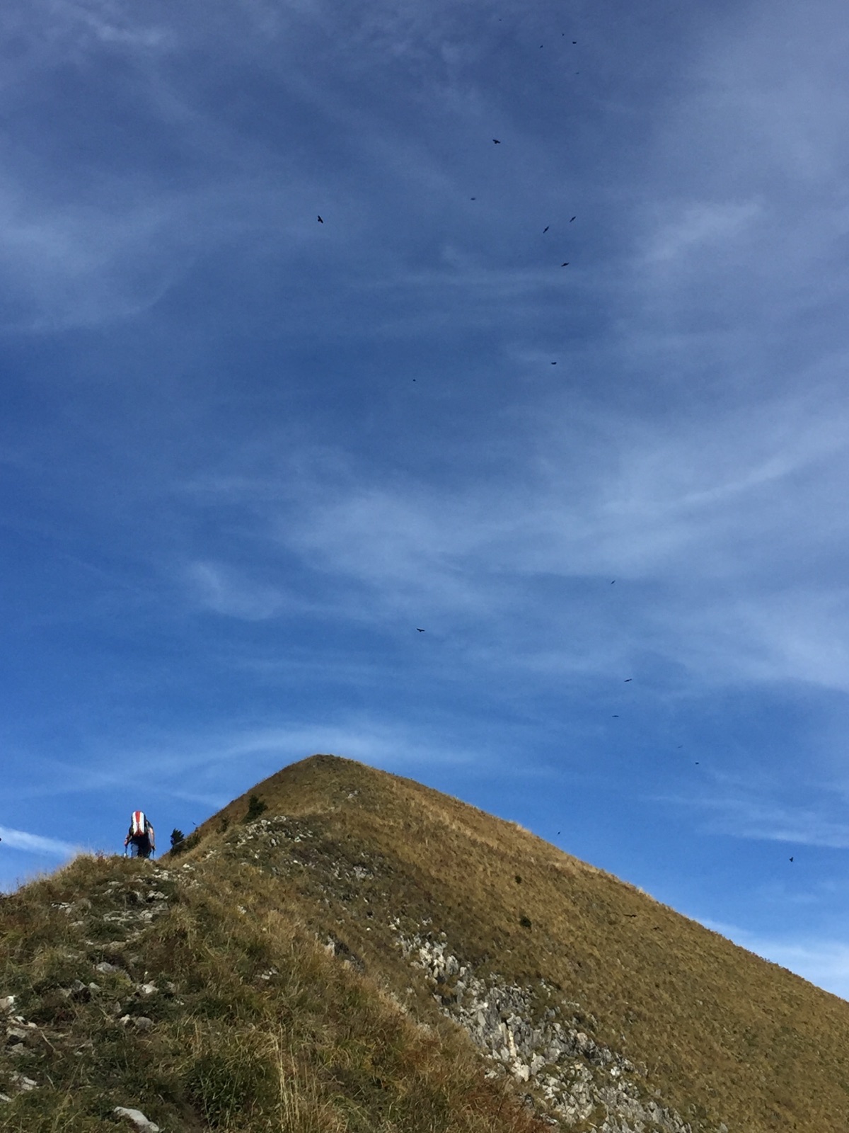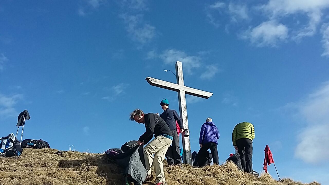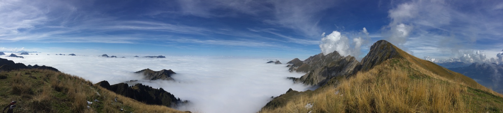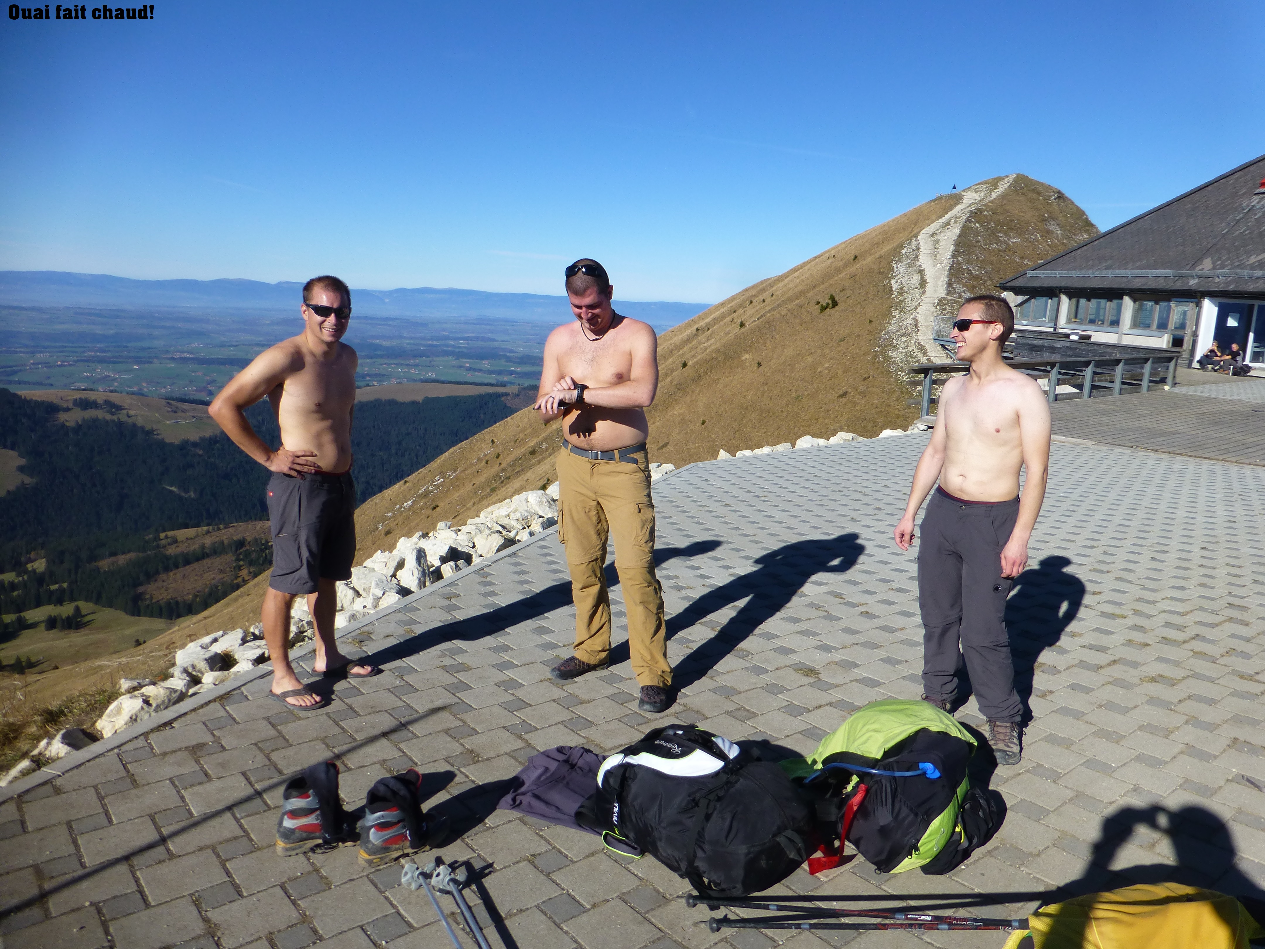 Superbe montée sous le soleil, le brouillard nous suis, mais arrive pas à nous rattraper, djeu ce qu’on marche vite!!! Là-haut thermiques au Sud, donc feu sur du coton et attéro au soleil, mais dans une bonne bise (vent de vallée) à château d’Oex. Bière de l’ours, train à vélo avec hôtesse  aimable et nous voilà en Gruyère.