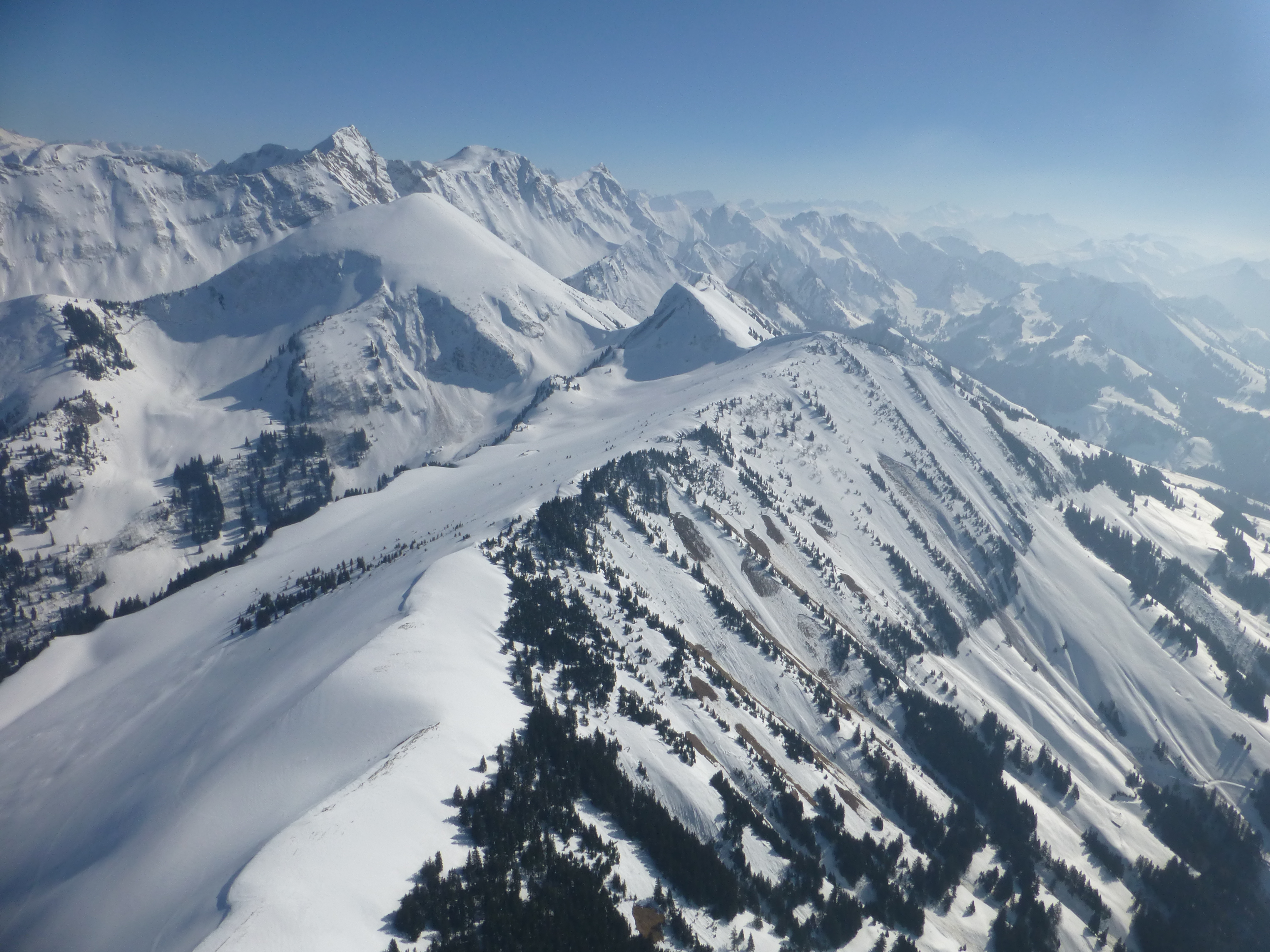 Faut en profiter, surtout là où y a pas de chasseur, bon dimanche y a pas de chasse, donc dimanche avec mes deux acolytes, on dit: Dent de Lyss, ah… c’est dans la couche… dessus ouvert, dessous bouché! Bon on dit Millet par le Litty… ahhhh la couche hummmm épaisse, les joyeux lurons du Tsermon l’on traversé ce matin… mais bon on est plus le matin, alors hop, Praz de Cray et le soleil partout au sud (donc Pays d’Enhaut ouvert) la peuffff partout au nord!